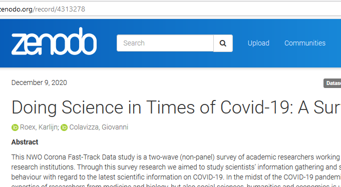 The COVID-19 pandemic has transformed the channels and methods through which scientific findings are communicated. Instead of waiting to publish a full journal article, scientists already reveal ‘tidbits of scientific data’ through preprints, which contributed to fast sharing of early and crucial insights (Koerber, 2020). More than ever, experts find themselves in a role in which they have to correct rapidly circulating misinformation. In this global health crisis, reliance on scientific experts is of vital importance. In June-August, we – Giovanni Colavizza and Karlijn Roex – conducted a survey study among academic researchers. We are currently conducting a second round of the survey. All academic researchers based in The Netherlands can participate through this link.