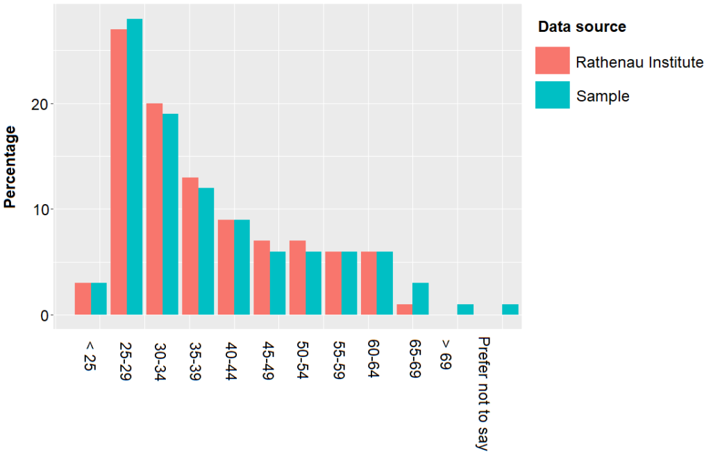 The resulting working sample is strongly representative with respect to academic position and age. Starting with age (N = 494), we see that people in their late-twenties (25-29) comprised the largest relative group in our sample (28.1%), followed by those in their early-thirties (18.6%) and late-thirties (11.7%). The smallest group of respondents comprised those over 70 (1%), those over 65 and those under 25 (each 3%). This closely resembles the age distribution within the Netherlands-based academic community. Figure 1 shows the proportions of age-groups in our own sample compared to the Rathenau Institute statistics about the research population of the Netherlands (Cijfers over universitair personeel, WOPI, Rathenau Instituut, 2019 and Het personeel bij de universitair medische centra, Rathenau Instituut, 2020).