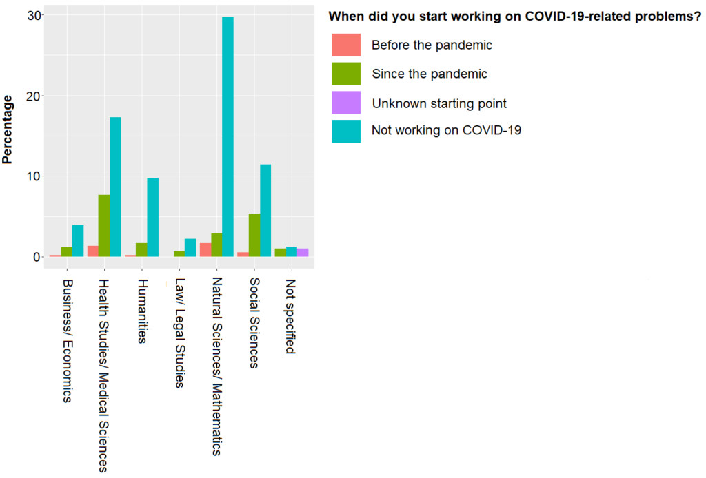 Regardless of when people started, the two academic fields that are most represented in COVID-19-related research (N = 574) are Health Studies and Medical Sciences and Social Sciences. More than a third of the scholars (34%) in each field had been undertaking COVID-19 related research. Surprisingly, only 13% of the scholars in Natural Sciences and Mathematics (among which many biological sciences) are conducing COVID-19 related work. The percentages for Law and Legal Studies and Business and Economics are notably high, but this is likely due to their small sample size.