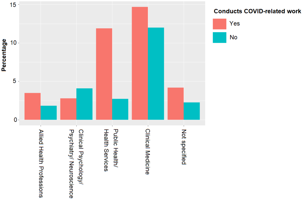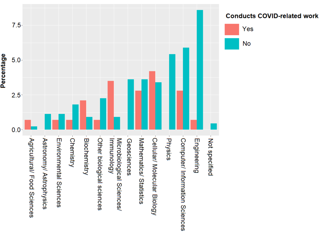 We also asked respondents whether they have been conducting academic research that was COVID-19 related. We received 585 replies. A quarter (24.4%) answered affirmatively, whereas the other three-quarter (75.6%) indicated they had not. Among this quarter that studied COVID-19 related questions (N = 143), a small minority indicated they had studied problems related to pandemics or coronaviruses before the global outbreak. In other words: 16.1% of the respondents that actively researches COVID-19 related questions, had already been studying such topics before the official WHO-declared start of the SARS-CoV-2 pandemic. Perhaps not surprisingly, these 23 scholars were predominantly working in the Natural Sciences and Mathematics (43.5%) – mostly Cellular, Molecular Biology and Microbiological Sciences, Immunology (each 30%).